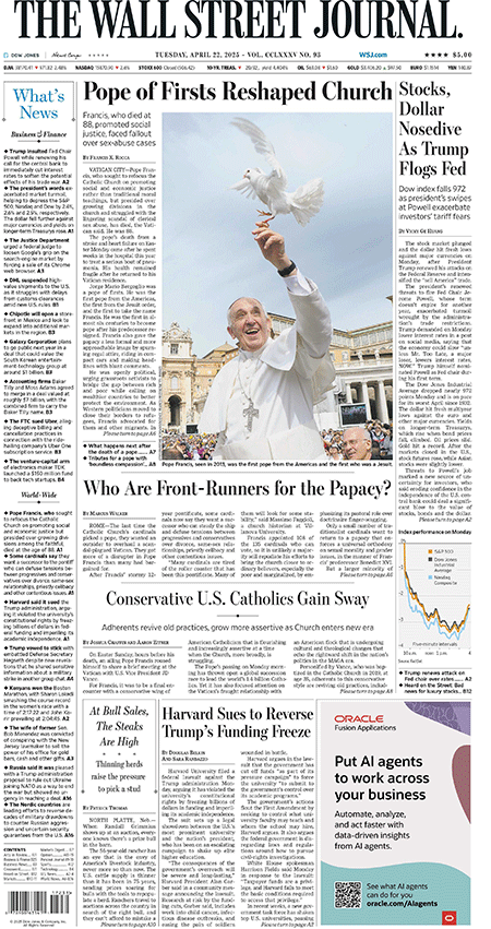Papa Franja, koji je reformisao Katoličku crkvu, naglašavajući socijalnu pravdu, preminuo je u Vatikanu nakon upale pluća. Konklava će odlučiti o nasledniku, dok se sukobljavaju vizije progresivaca i konzervativaca unutar Crkve. SAD nastavljaju diplomatske pregovore za mir u Ukrajini. Peking upozorava da će odgovoriti na bilo kakve sporazume drugih zemalja sa SAD koji narušavaju trgovinske interese Kine. Smrt pape je iznenadila vernike nakon njegovog pojavljivanja na Trgu Svetog Petra za Uskrs. Kina je optužila SAD za „jednostrano nasilništvo“.